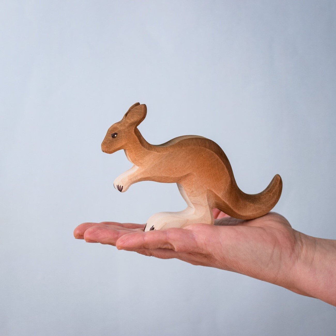 Diese Familie hüpft direkt ins Herz: Ein großes Känguru, eine fürsorgliche Mutter mit ihrem winzigen Joey im Beutel und ein neugieriges Junges bilden zusammen eine Szene voller Leben, Fürsorge und Entdeckungsfreude. Die Figuren zeigen unterschiedliche Körperhaltungen – mal aufrecht, mal in Bewegung, mal in inniger Nähe.